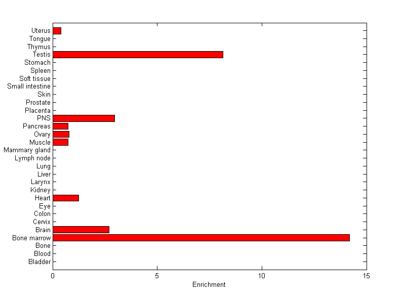 About the profile: The expression level is normalized with tissue-library size. Each value for a gene in a tissue is a ratio of observed ESTs to the expected one in this tissue. The expected number of ESTs is the product of total ESTs of the gene and the fraction of total ESTs in the tissue among all ESTs in 30 tissues. Summary: This gene is preferentially expressed in [bone_marrow, testis] Download: |