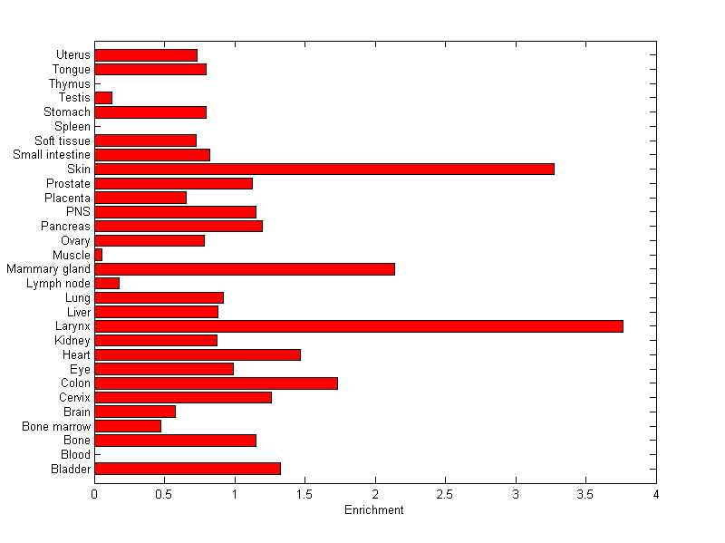The expression level is normalized with tissue-library size. Each value for a gene in a tissue is a ratio of observed ESTs to the expected one in this tissue. The expected number of ESTs is the product of total ESTs of the gene and the fraction of total ESTs in the tissue among all ESTs in 30 tissues.