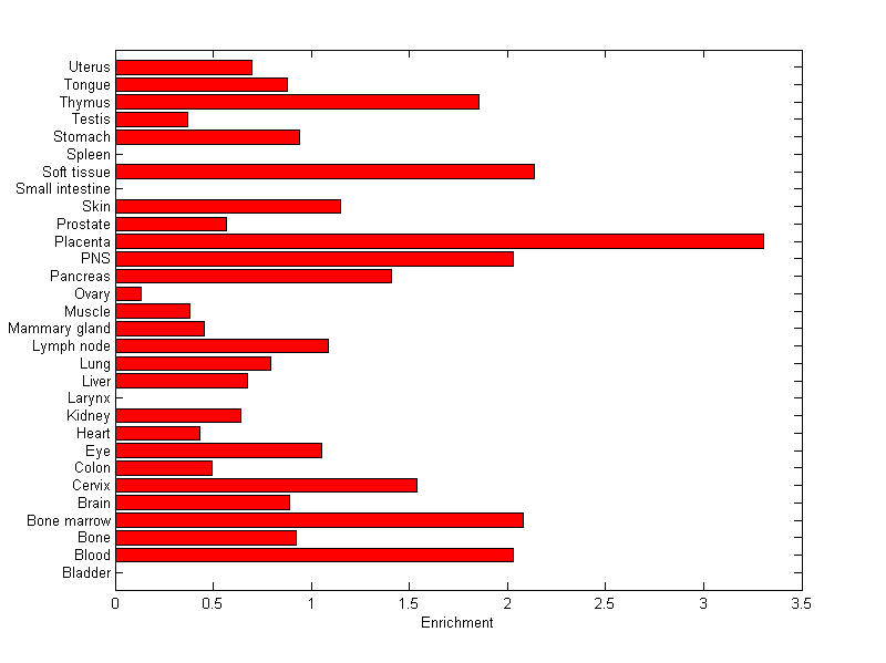 The expression level is normalized with tissue-library size. Each value for a gene in a tissue is a ratio of observed ESTs to the expected one in this tissue. The expected number of ESTs is the product of total ESTs of the gene and the fraction of total ESTs in the tissue among all ESTs in 30 tissues.