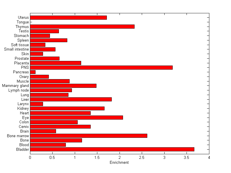 The expression level is normalized with tissue-library size. Each value for a gene in a tissue is a ratio of observed ESTs to the expected one in this tissue. The expected number of ESTs is the product of total ESTs of the gene and the fraction of total ESTs in the tissue among all ESTs in 30 tissues.