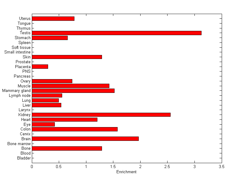 The expression level is normalized with tissue-library size. Each value for a gene in a tissue is a ratio of observed ESTs to the expected one in this tissue. The expected number of ESTs is the product of total ESTs of the gene and the fraction of total ESTs in the tissue among all ESTs in 30 tissues.