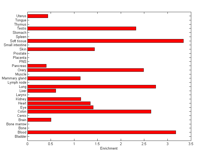 The expression level is normalized with tissue-library size. Each value for a gene in a tissue is a ratio of observed ESTs to the expected one in this tissue. The expected number of ESTs is the product of total ESTs of the gene and the fraction of total ESTs in the tissue among all ESTs in 30 tissues.