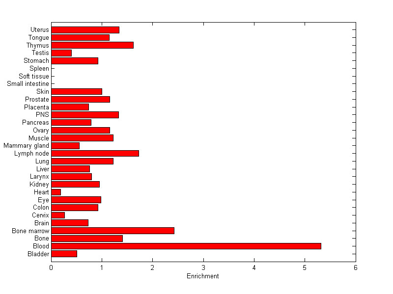 The expression level is normalized with tissue-library size. Each value for a gene in a tissue is a ratio of observed ESTs to the expected one in this tissue. The expected number of ESTs is the product of total ESTs of the gene and the fraction of total ESTs in the tissue among all ESTs in 30 tissues.