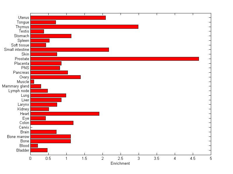 The expression level is normalized with tissue-library size. Each value for a gene in a tissue is a ratio of observed ESTs to the expected one in this tissue. The expected number of ESTs is the product of total ESTs of the gene and the fraction of total ESTs in the tissue among all ESTs in 30 tissues.