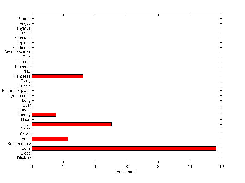 The expression level is normalized with tissue-library size. Each value for a gene in a tissue is a ratio of observed ESTs to the expected one in this tissue. The expected number of ESTs is the product of total ESTs of the gene and the fraction of total ESTs in the tissue among all ESTs in 30 tissues.