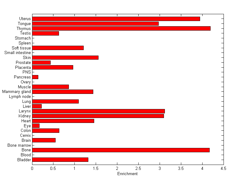 The expression level is normalized with tissue-library size. Each value for a gene in a tissue is a ratio of observed ESTs to the expected one in this tissue. The expected number of ESTs is the product of total ESTs of the gene and the fraction of total ESTs in the tissue among all ESTs in 30 tissues.