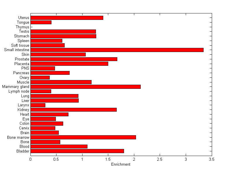The expression level is normalized with tissue-library size. Each value for a gene in a tissue is a ratio of observed ESTs to the expected one in this tissue. The expected number of ESTs is the product of total ESTs of the gene and the fraction of total ESTs in the tissue among all ESTs in 30 tissues.