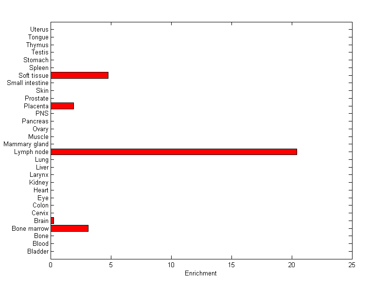 The expression level is normalized with tissue-library size. Each value for a gene in a tissue is a ratio of observed ESTs to the expected one in this tissue. The expected number of ESTs is the product of total ESTs of the gene and the fraction of total ESTs in the tissue among all ESTs in 30 tissues.