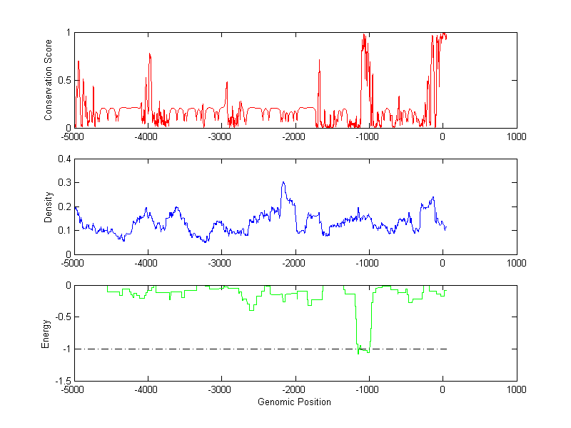 About the profiles: The conservation profile (red curve) is about conservation scores of the promoter sequences. Conservation was determined from an eight-way alignment of human, chimpanzee, dog, mouse, rat, chicken, zebrafish and fugu sequences. The conservation was quantified by a conservation score between 0 and 1, with 1 as highest conservation. The conservation score was obtained from UCSC genome databases. The density profile (blue curve) is about density of all TF binding sites. The energy profile (green curve) is about energy for module detection based on TF interaction. The positions with energy less than -1 indicate the existence of CRMs. Download: Conservation profileDensity profile Energy profile CRM summary |