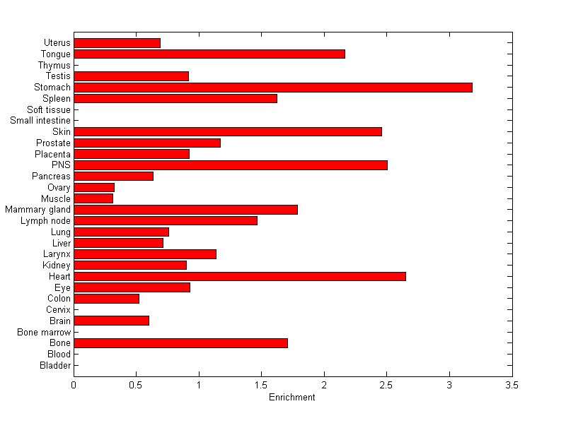 About the profile: The expression level is normalized with tissue-library size. Each value for a gene in a tissue is a ratio of observed ESTs to the expected one in this tissue. The expected number of ESTs is the product of total ESTs of the gene and the fraction of total ESTs in the tissue among all ESTs in 30 tissues. Download: |