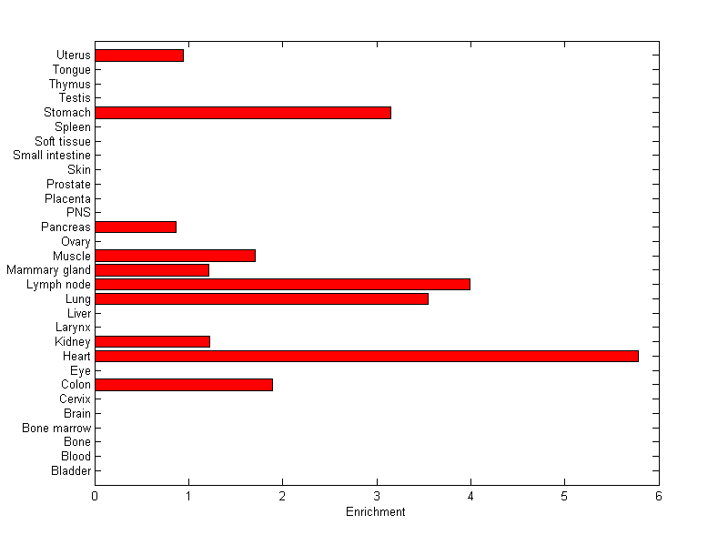 The expression level is normalized with tissue-library size. Each value for a gene in a tissue is a ratio of observed ESTs to the expected one in this tissue. The expected number of ESTs is the product of total ESTs of the gene and the fraction of total ESTs in the tissue among all ESTs in 30 tissues.