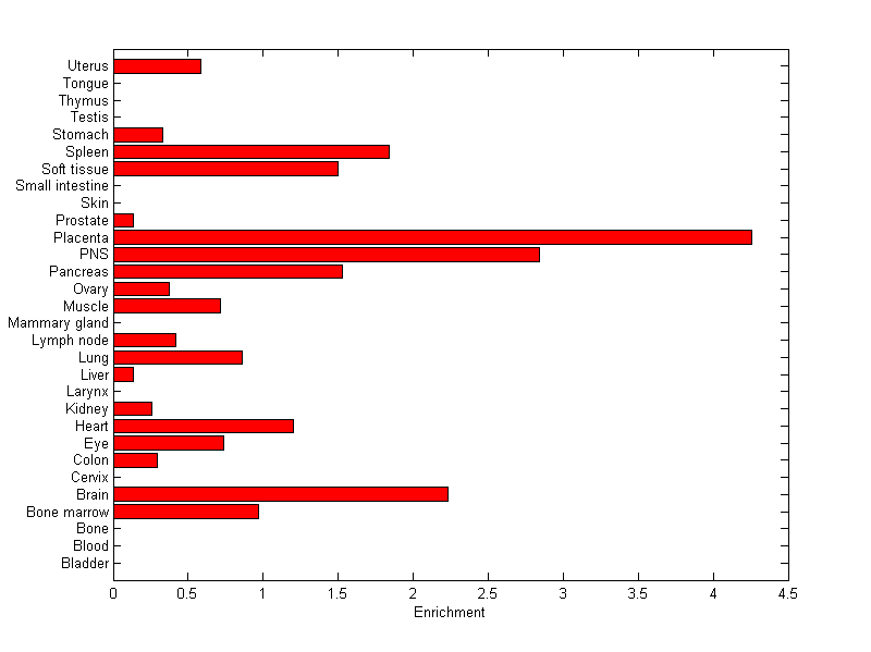 The expression level is normalized with tissue-library size. Each value for a gene in a tissue is a ratio of observed ESTs to the expected one in this tissue. The expected number of ESTs is the product of total ESTs of the gene and the fraction of total ESTs in the tissue among all ESTs in 30 tissues.