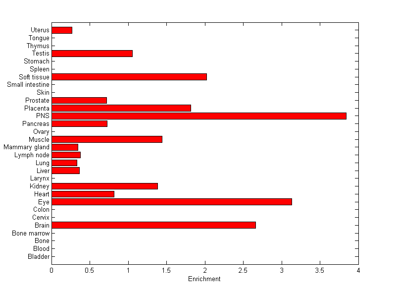 The expression level is normalized with tissue-library size. Each value for a gene in a tissue is a ratio of observed ESTs to the expected one in this tissue. The expected number of ESTs is the product of total ESTs of the gene and the fraction of total ESTs in the tissue among all ESTs in 30 tissues.