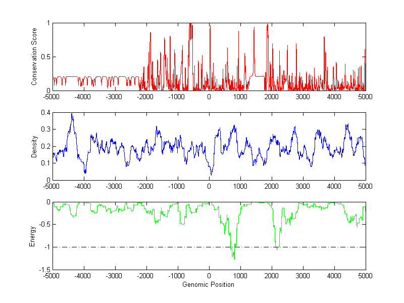The energy profile (green curve) is about energy for module detection based on TF interaction. The positions with energy less than -1 indicate the existence of CRMs.