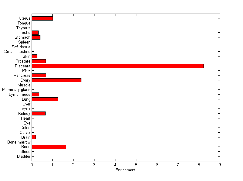 The expression level is normalized with tissue-library size. Each value for a gene in a tissue is a ratio of observed ESTs to the expected one in this tissue. The expected number of ESTs is the product of total ESTs of the gene and the fraction of total ESTs in the tissue among all ESTs in 30 tissues.