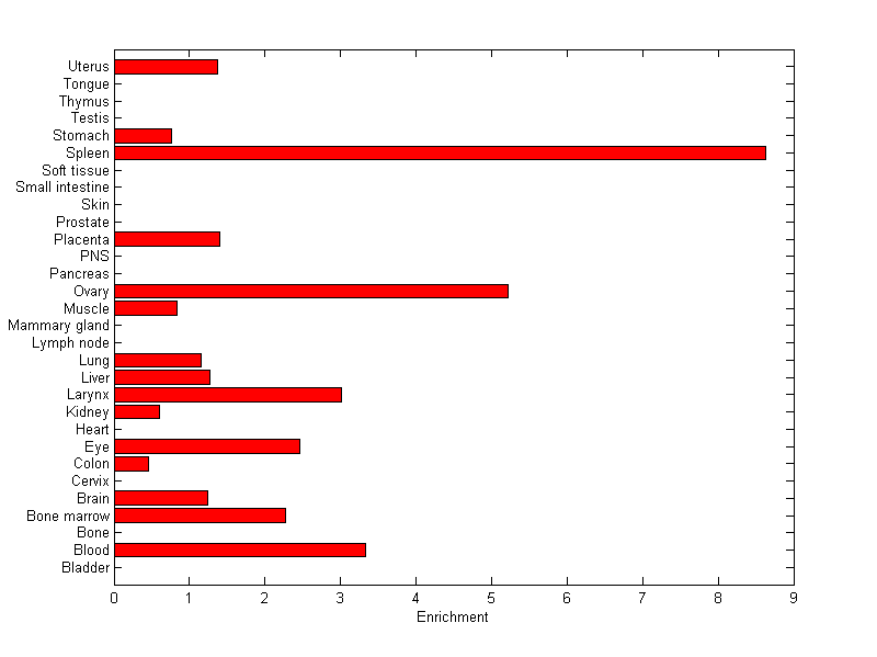The expression level is normalized with tissue-library size. Each value for a gene in a tissue is a ratio of observed ESTs to the expected one in this tissue. The expected number of ESTs is the product of total ESTs of the gene and the fraction of total ESTs in the tissue among all ESTs in 30 tissues.