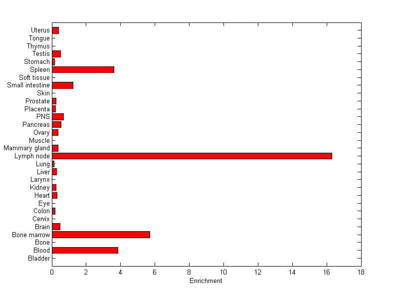 About the profile: The expression level is normalized with tissue-library size. Each value for a gene in a tissue is a ratio of observed ESTs to the expected one in this tissue. The expected number of ESTs is the product of total ESTs of the gene and the fraction of total ESTs in the tissue among all ESTs in 30 tissues. Summary: This gene is preferentially expressed in [bone_marrow, lymph_node] Download: |