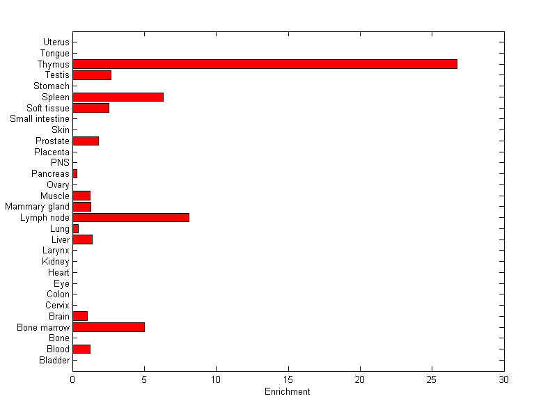About the profile: The expression level is normalized with tissue-library size. Each value for a gene in a tissue is a ratio of observed ESTs to the expected one in this tissue. The expected number of ESTs is the product of total ESTs of the gene and the fraction of total ESTs in the tissue among all ESTs in 30 tissues. Summary: This gene is preferentially expressed in [lymph_node, thymus] Download: |