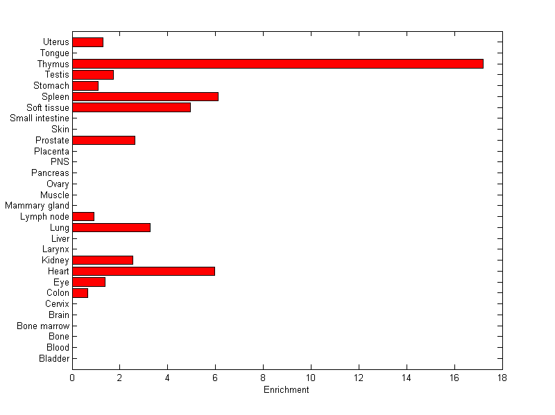 The expression level is normalized with tissue-library size. Each value for a gene in a tissue is a ratio of observed ESTs to the expected one in this tissue. The expected number of ESTs is the product of total ESTs of the gene and the fraction of total ESTs in the tissue among all ESTs in 30 tissues.