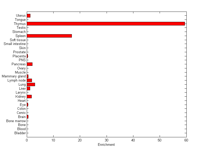 About the profile: The expression level is normalized with tissue-library size. Each value for a gene in a tissue is a ratio of observed ESTs to the expected one in this tissue. The expected number of ESTs is the product of total ESTs of the gene and the fraction of total ESTs in the tissue among all ESTs in 30 tissues. Summary: This gene is preferentially expressed in [spleen, thymus] Download: |