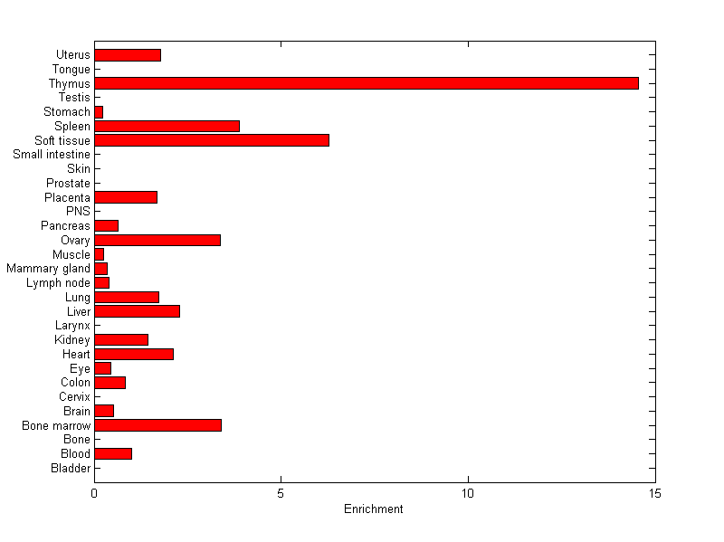 The expression level is normalized with tissue-library size. Each value for a gene in a tissue is a ratio of observed ESTs to the expected one in this tissue. The expected number of ESTs is the product of total ESTs of the gene and the fraction of total ESTs in the tissue among all ESTs in 30 tissues.