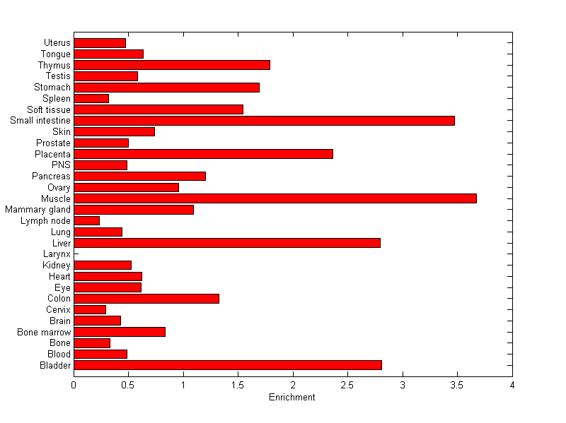The expression level is normalized with tissue-library size. Each value for a gene in a tissue is a ratio of observed ESTs to the expected one in this tissue. The expected number of ESTs is the product of total ESTs of the gene and the fraction of total ESTs in the tissue among all ESTs in 30 tissues.
