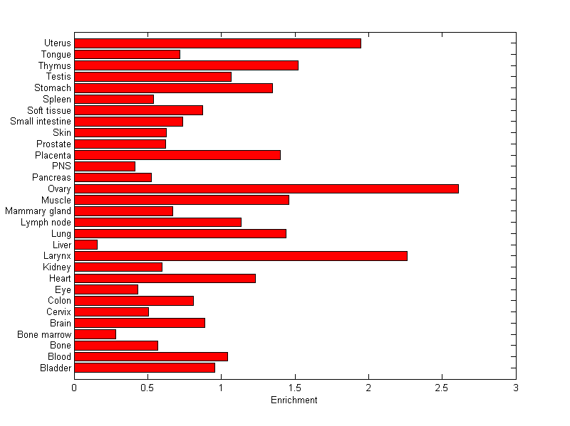 The expression level is normalized with tissue-library size. Each value for a gene in a tissue is a ratio of observed ESTs to the expected one in this tissue. The expected number of ESTs is the product of total ESTs of the gene and the fraction of total ESTs in the tissue among all ESTs in 30 tissues.