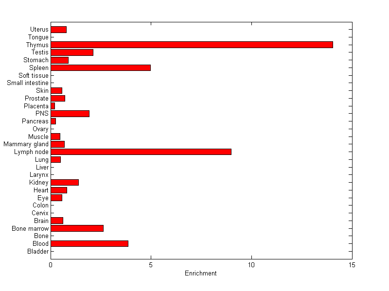 The expression level is normalized with tissue-library size. Each value for a gene in a tissue is a ratio of observed ESTs to the expected one in this tissue. The expected number of ESTs is the product of total ESTs of the gene and the fraction of total ESTs in the tissue among all ESTs in 30 tissues.