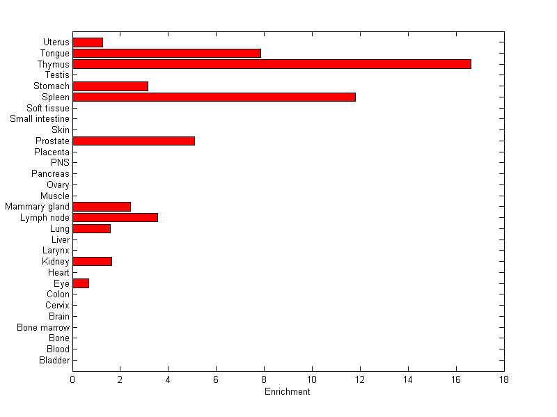The expression level is normalized with tissue-library size. Each value for a gene in a tissue is a ratio of observed ESTs to the expected one in this tissue. The expected number of ESTs is the product of total ESTs of the gene and the fraction of total ESTs in the tissue among all ESTs in 30 tissues.