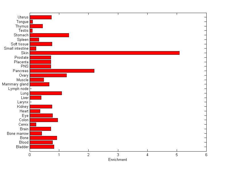 The expression level is normalized with tissue-library size. Each value for a gene in a tissue is a ratio of observed ESTs to the expected one in this tissue. The expected number of ESTs is the product of total ESTs of the gene and the fraction of total ESTs in the tissue among all ESTs in 30 tissues.
