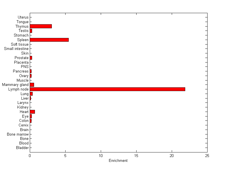 The expression level is normalized with tissue-library size. Each value for a gene in a tissue is a ratio of observed ESTs to the expected one in this tissue. The expected number of ESTs is the product of total ESTs of the gene and the fraction of total ESTs in the tissue among all ESTs in 30 tissues.