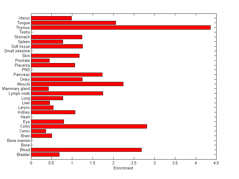 The expression level is normalized with tissue-library size. Each value for a gene in a tissue is a ratio of observed ESTs to the expected one in this tissue. The expected number of ESTs is the product of total ESTs of the gene and the fraction of total ESTs in the tissue among all ESTs in 30 tissues.