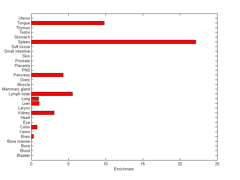 The expression level is normalized with tissue-library size. Each value for a gene in a tissue is a ratio of observed ESTs to the expected one in this tissue. The expected number of ESTs is the product of total ESTs of the gene and the fraction of total ESTs in the tissue among all ESTs in 30 tissues.