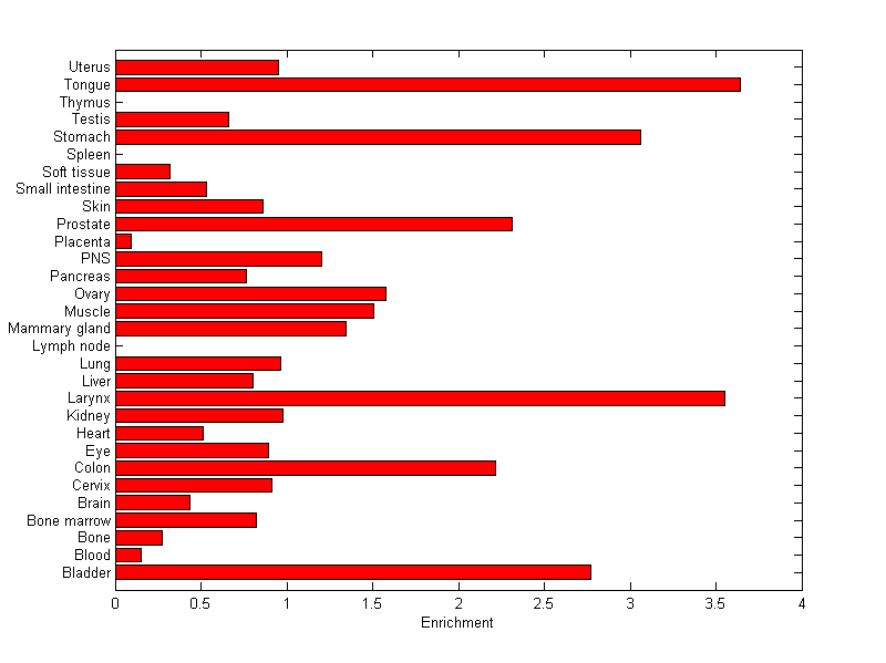 The expression level is normalized with tissue-library size. Each value for a gene in a tissue is a ratio of observed ESTs to the expected one in this tissue. The expected number of ESTs is the product of total ESTs of the gene and the fraction of total ESTs in the tissue among all ESTs in 30 tissues.