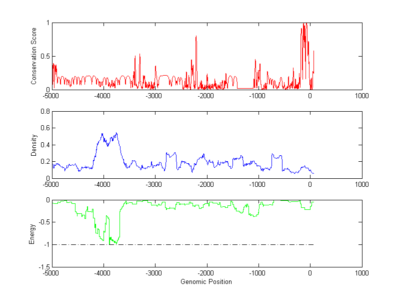 The energy profile (green curve) is about energy for module detection based on TF interaction. The positions with energy less than -1 indicate the existence of CRMs.