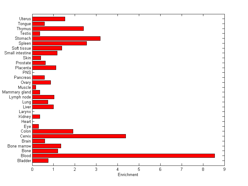The expression level is normalized with tissue-library size. Each value for a gene in a tissue is a ratio of observed ESTs to the expected one in this tissue. The expected number of ESTs is the product of total ESTs of the gene and the fraction of total ESTs in the tissue among all ESTs in 30 tissues.