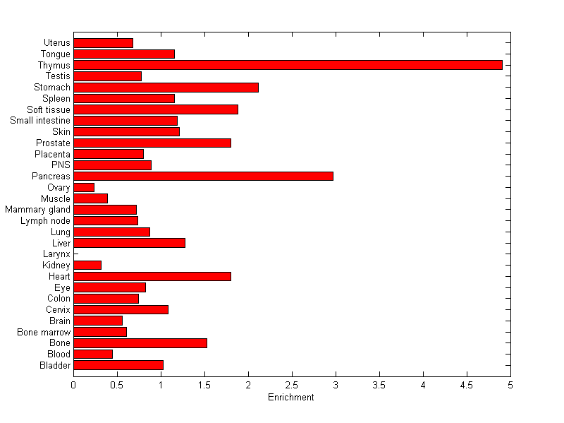 The expression level is normalized with tissue-library size. Each value for a gene in a tissue is a ratio of observed ESTs to the expected one in this tissue. The expected number of ESTs is the product of total ESTs of the gene and the fraction of total ESTs in the tissue among all ESTs in 30 tissues.