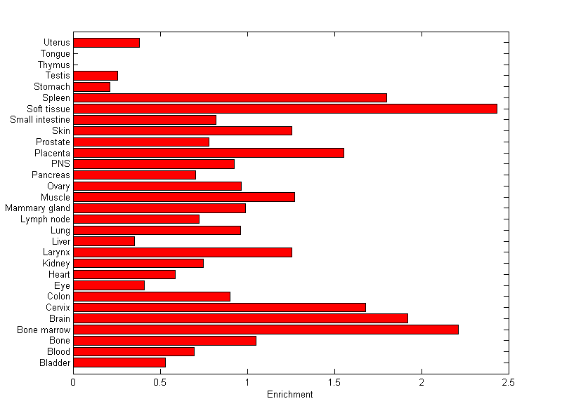 The expression level is normalized with tissue-library size. Each value for a gene in a tissue is a ratio of observed ESTs to the expected one in this tissue. The expected number of ESTs is the product of total ESTs of the gene and the fraction of total ESTs in the tissue among all ESTs in 30 tissues.