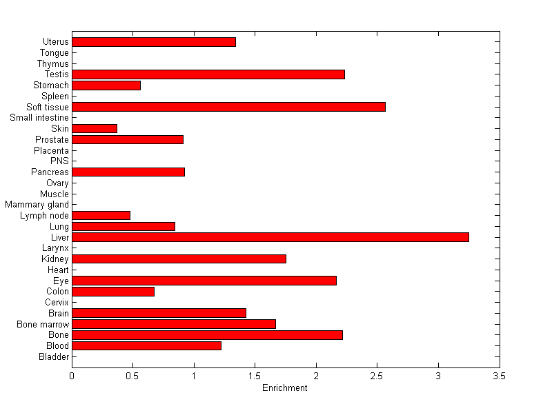 The expression level is normalized with tissue-library size. Each value for a gene in a tissue is a ratio of observed ESTs to the expected one in this tissue. The expected number of ESTs is the product of total ESTs of the gene and the fraction of total ESTs in the tissue among all ESTs in 30 tissues.