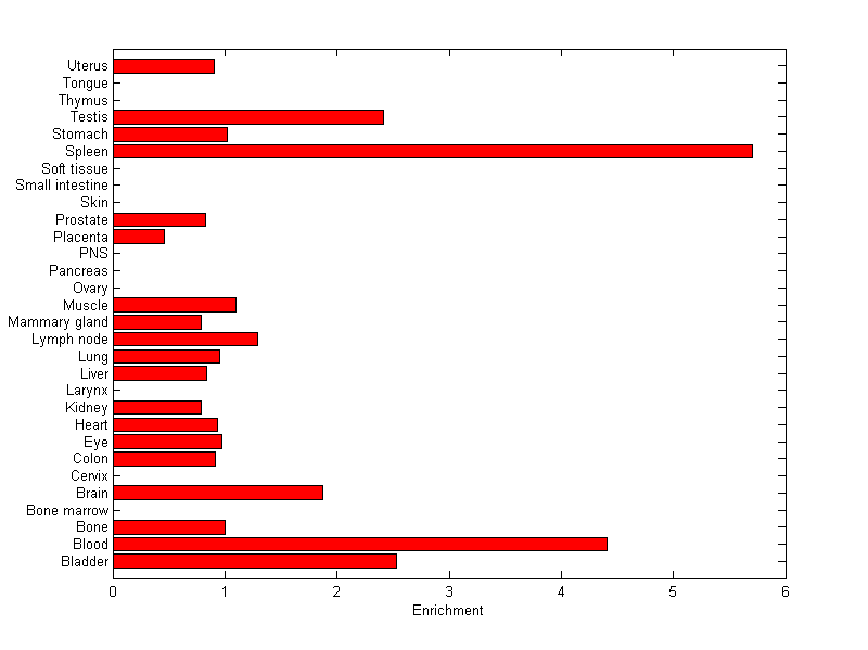 The expression level is normalized with tissue-library size. Each value for a gene in a tissue is a ratio of observed ESTs to the expected one in this tissue. The expected number of ESTs is the product of total ESTs of the gene and the fraction of total ESTs in the tissue among all ESTs in 30 tissues.