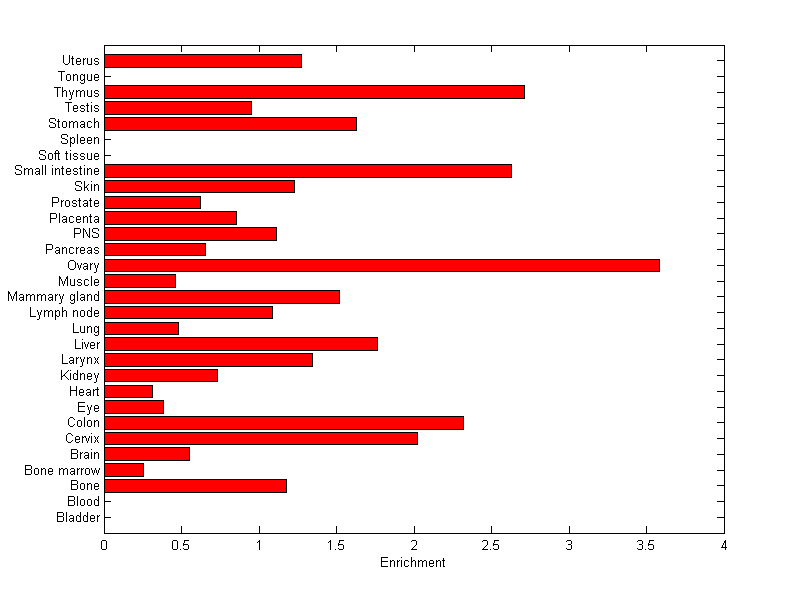 The expression level is normalized with tissue-library size. Each value for a gene in a tissue is a ratio of observed ESTs to the expected one in this tissue. The expected number of ESTs is the product of total ESTs of the gene and the fraction of total ESTs in the tissue among all ESTs in 30 tissues.
