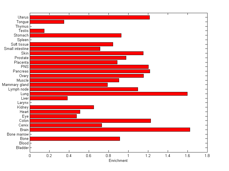 The expression level is normalized with tissue-library size. Each value for a gene in a tissue is a ratio of observed ESTs to the expected one in this tissue. The expected number of ESTs is the product of total ESTs of the gene and the fraction of total ESTs in the tissue among all ESTs in 30 tissues.