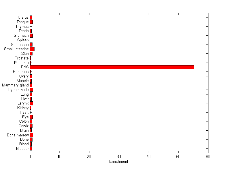 The expression level is normalized with tissue-library size. Each value for a gene in a tissue is a ratio of observed ESTs to the expected one in this tissue. The expected number of ESTs is the product of total ESTs of the gene and the fraction of total ESTs in the tissue among all ESTs in 30 tissues.