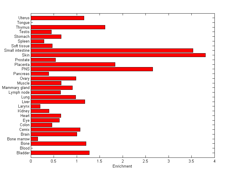 The expression level is normalized with tissue-library size. Each value for a gene in a tissue is a ratio of observed ESTs to the expected one in this tissue. The expected number of ESTs is the product of total ESTs of the gene and the fraction of total ESTs in the tissue among all ESTs in 30 tissues.
