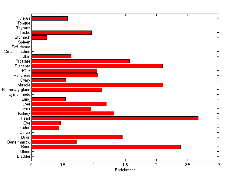 The expression level is normalized with tissue-library size. Each value for a gene in a tissue is a ratio of observed ESTs to the expected one in this tissue. The expected number of ESTs is the product of total ESTs of the gene and the fraction of total ESTs in the tissue among all ESTs in 30 tissues.