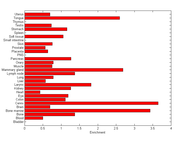The expression level is normalized with tissue-library size. Each value for a gene in a tissue is a ratio of observed ESTs to the expected one in this tissue. The expected number of ESTs is the product of total ESTs of the gene and the fraction of total ESTs in the tissue among all ESTs in 30 tissues.