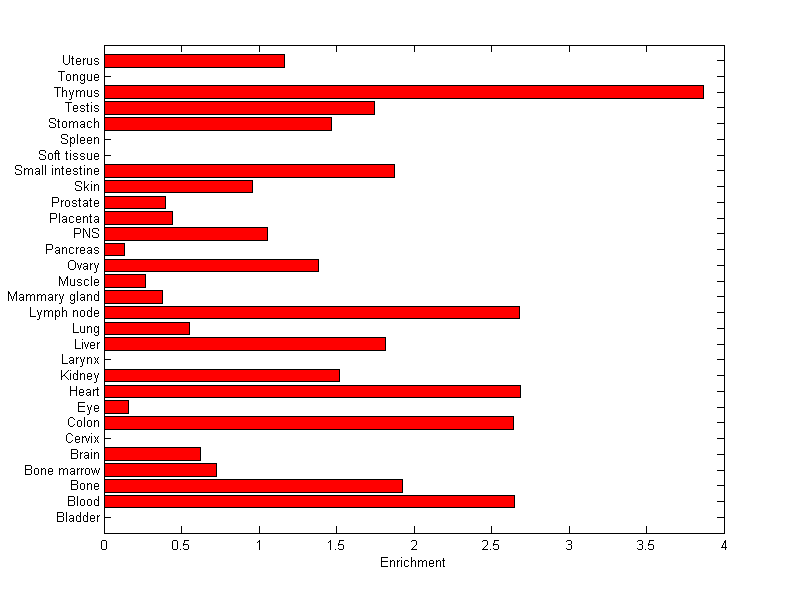 The expression level is normalized with tissue-library size. Each value for a gene in a tissue is a ratio of observed ESTs to the expected one in this tissue. The expected number of ESTs is the product of total ESTs of the gene and the fraction of total ESTs in the tissue among all ESTs in 30 tissues.