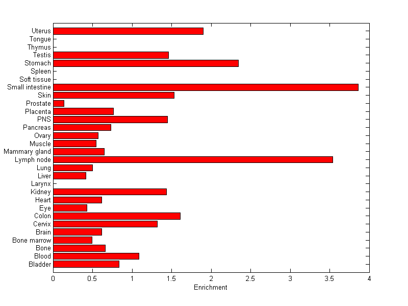 The expression level is normalized with tissue-library size. Each value for a gene in a tissue is a ratio of observed ESTs to the expected one in this tissue. The expected number of ESTs is the product of total ESTs of the gene and the fraction of total ESTs in the tissue among all ESTs in 30 tissues.