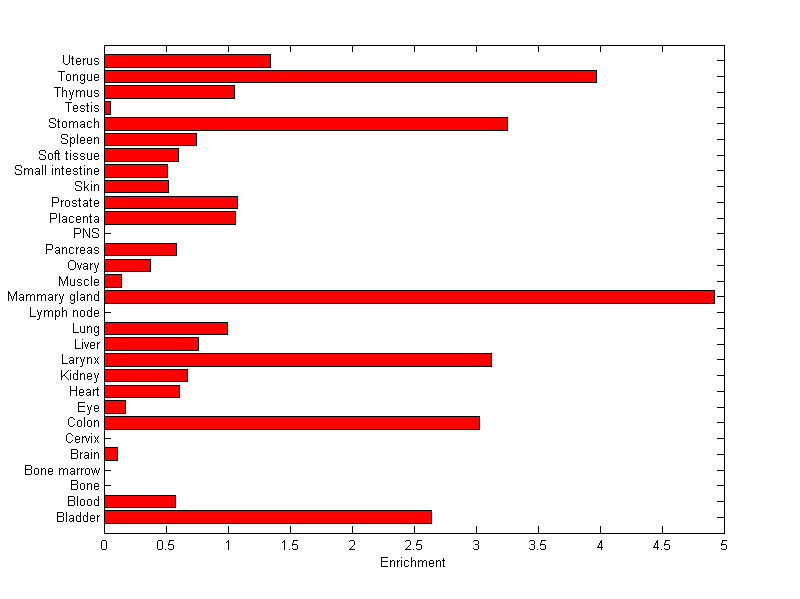The expression level is normalized with tissue-library size. Each value for a gene in a tissue is a ratio of observed ESTs to the expected one in this tissue. The expected number of ESTs is the product of total ESTs of the gene and the fraction of total ESTs in the tissue among all ESTs in 30 tissues.