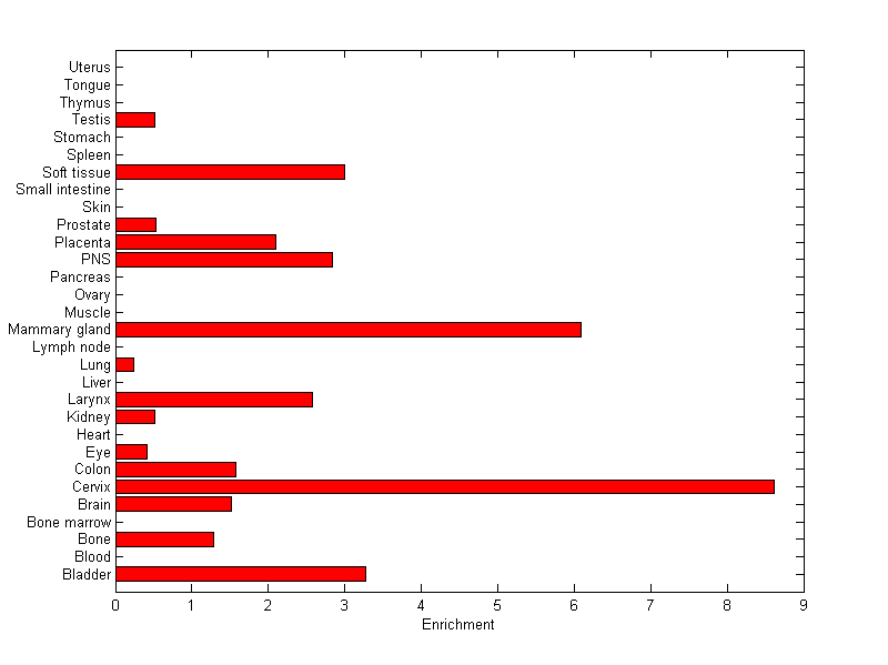 About the profile: The expression level is normalized with tissue-library size. Each value for a gene in a tissue is a ratio of observed ESTs to the expected one in this tissue. The expected number of ESTs is the product of total ESTs of the gene and the fraction of total ESTs in the tissue among all ESTs in 30 tissues. Summary: This gene is preferentially expressed in [cervix, mammary_gland] Download: |